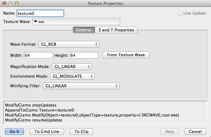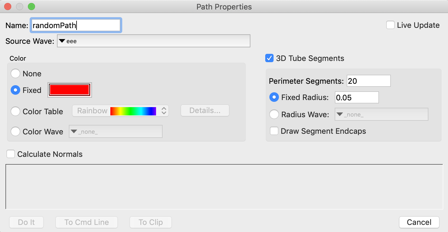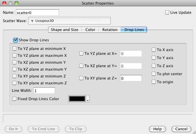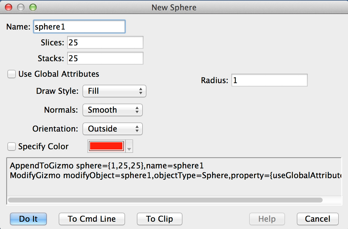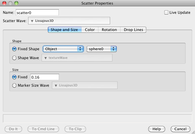 You create a Gizmo window by choosing Windows→New→3D Plot and then appending graphic objects using the Gizmo menu. You can do this without any knowledge of OpenGL. At this level you can create surface plots, scatter plots, path plots, voxelgrams, isosurface plots, 3D bar plots and 3D pie charts. Such objects are called "wave-based objects" or "data objects" to differentiate them from drawing objects, discussed next. After creating the basic plot you can modify various properties using Gizmo's "info" window.