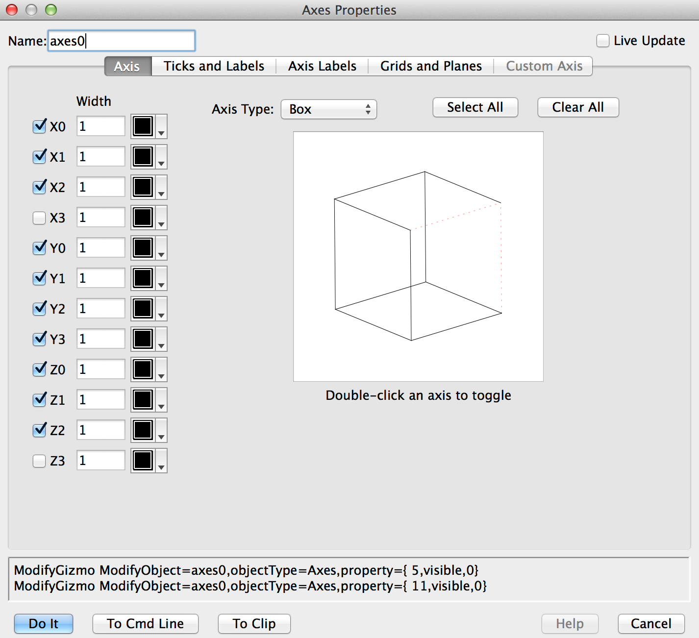 You can also double click the axes0 object and select the Axis tab. The properties dialog displays the box axes. If you now hover with the mouse cursor over any axis you see a tooltip that identifies the axis.