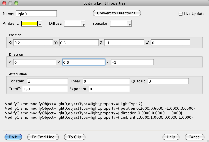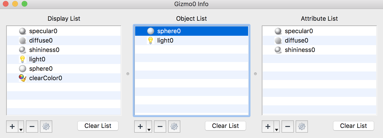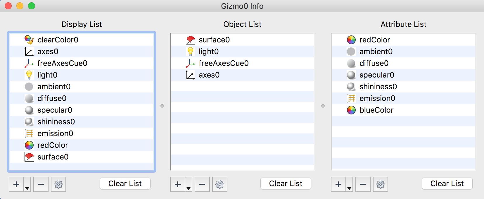 Gizmo supports advanced OpenGL features such as lighting effects, shininess and textures. Advanced users who want to create sophisticated 3D graphics will benefit from some familiarity with 3D graphics in general and OpenGL in particular.