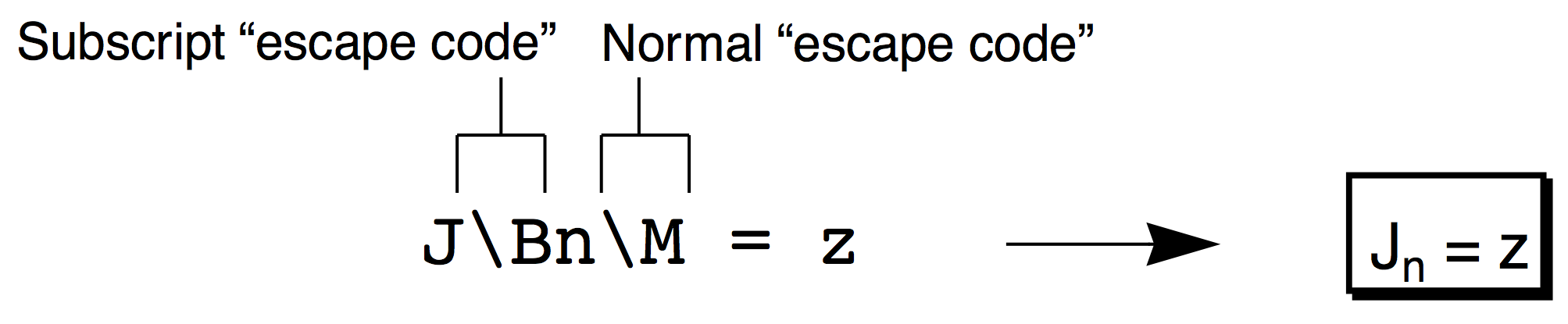In the example below, the subscript escape code "\B" begins a subscript and is not displayed in the annotation; the "n" that follows is plain text displayed as a subscript. The normal escape code "\M" overrides the subscript mode so that the plain text "= z" that follows has the original size and Y position (vertical offset) used for the "J".