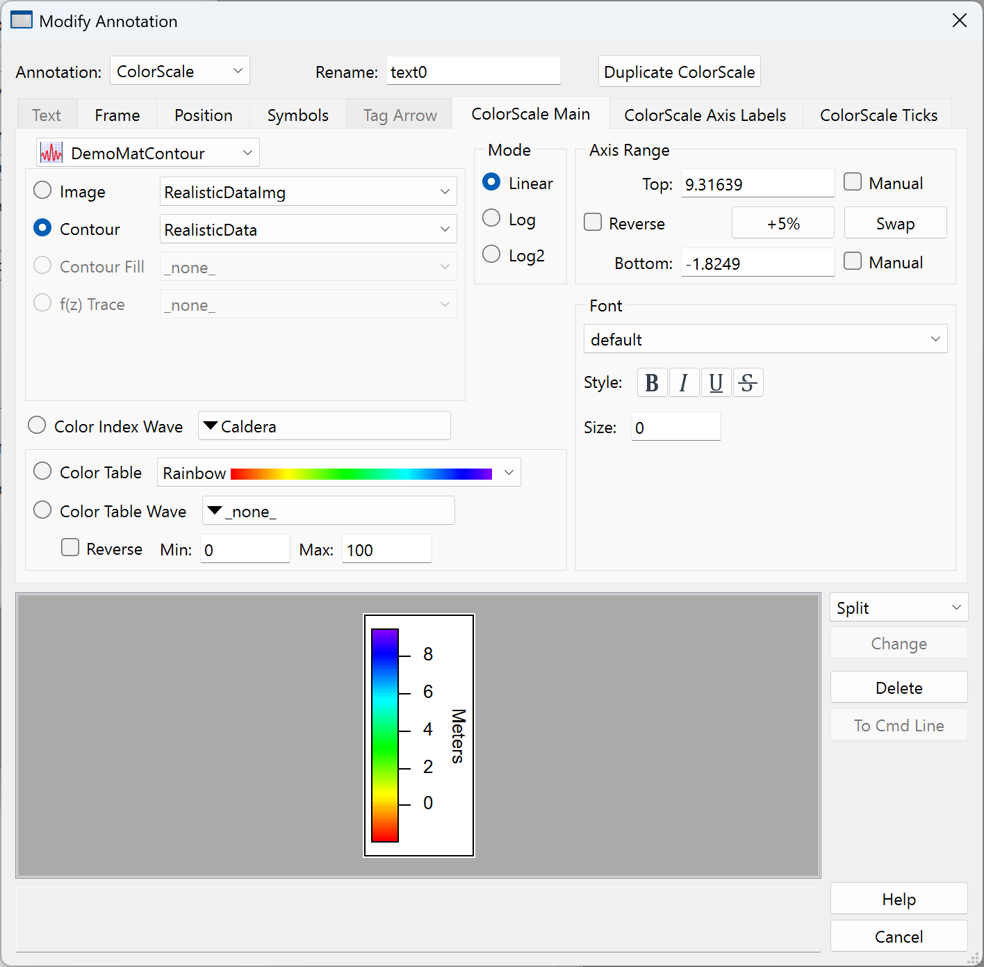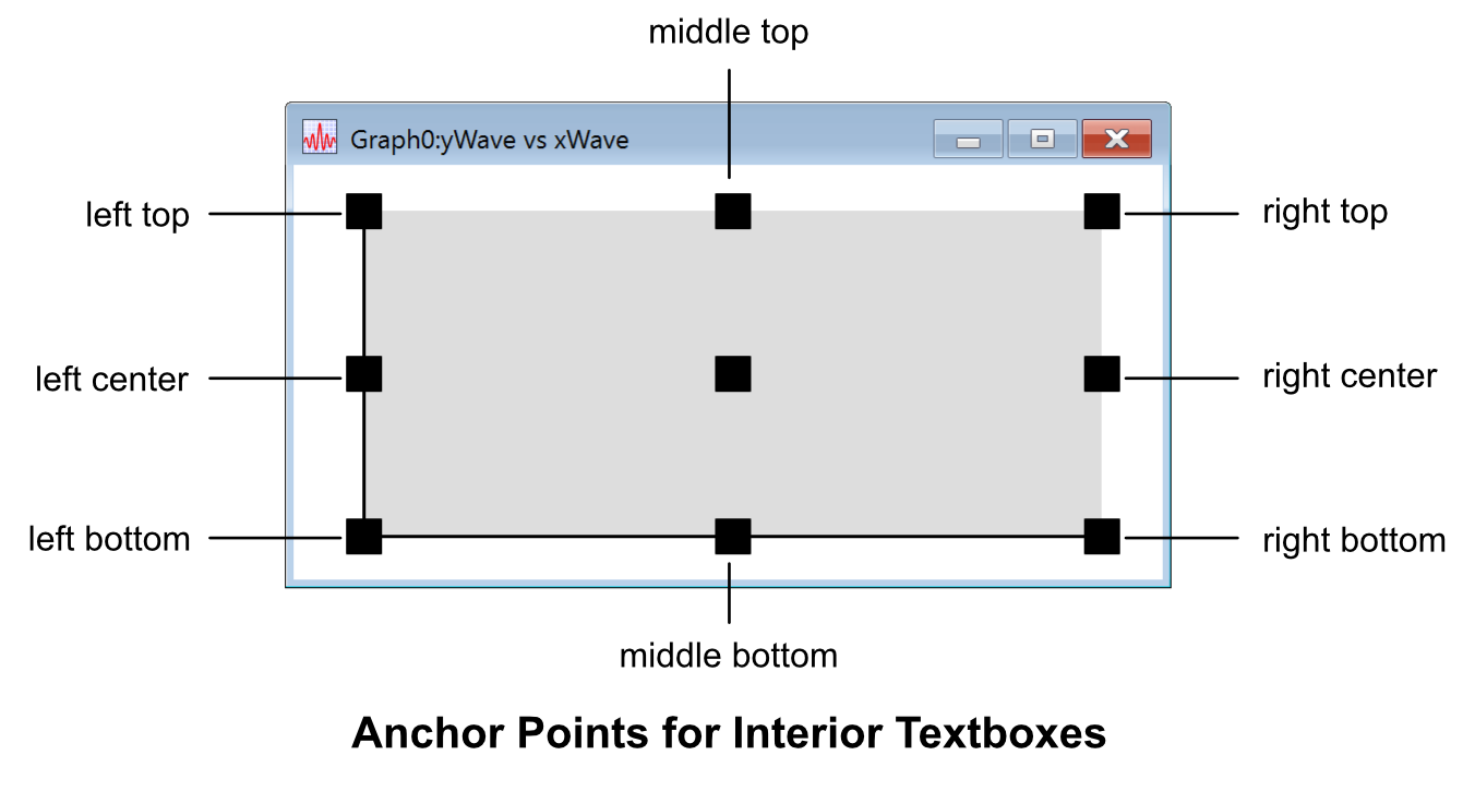 Most annotations contain text that you might use to describe the contents of a graph, point out a feature of a wave, identify the axis that applies to a wave, or create a legend. An annotation can also contain color scales showing the data range associated with colors in contour and image plots.