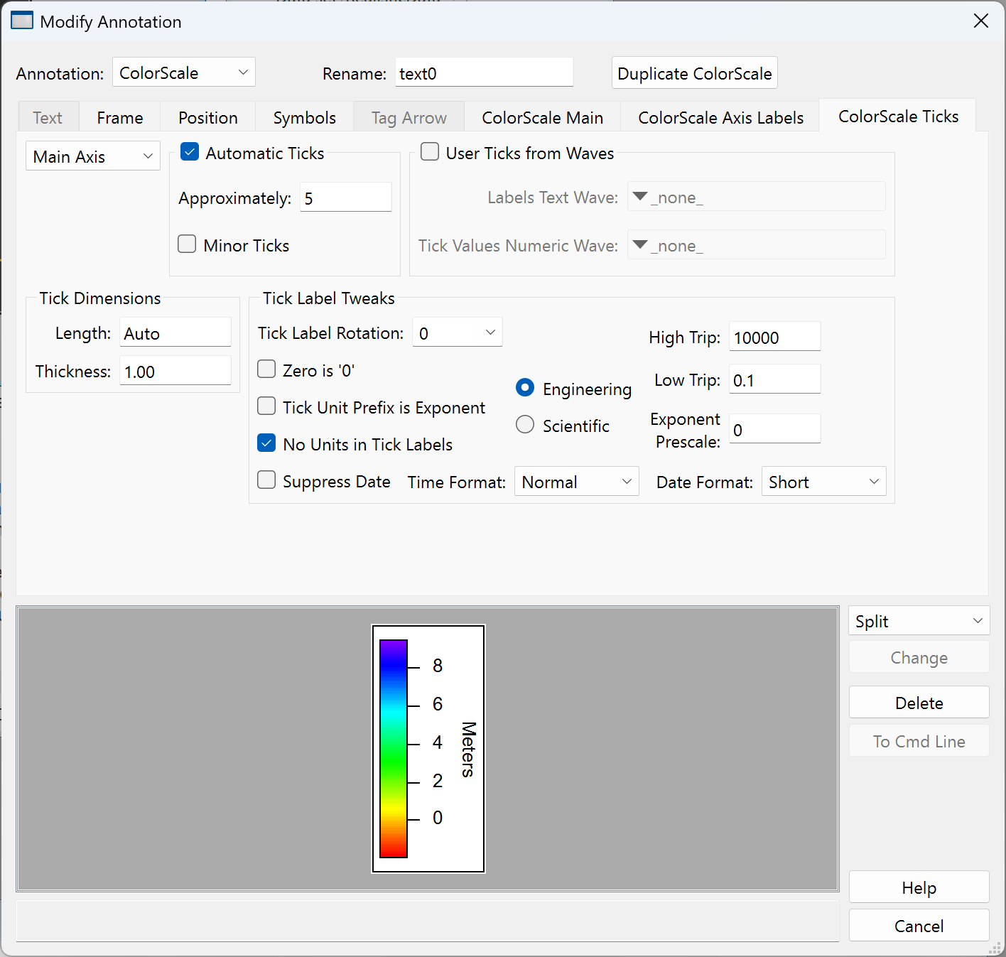 A color scale contains a color bar with an axis that spans the range of colors associated with the data. Color scales are automatically updated when the associated data changes. A color scale can also be completely disassociated from any data by directly specifying a named color table and an explicit numeric range for the axis.