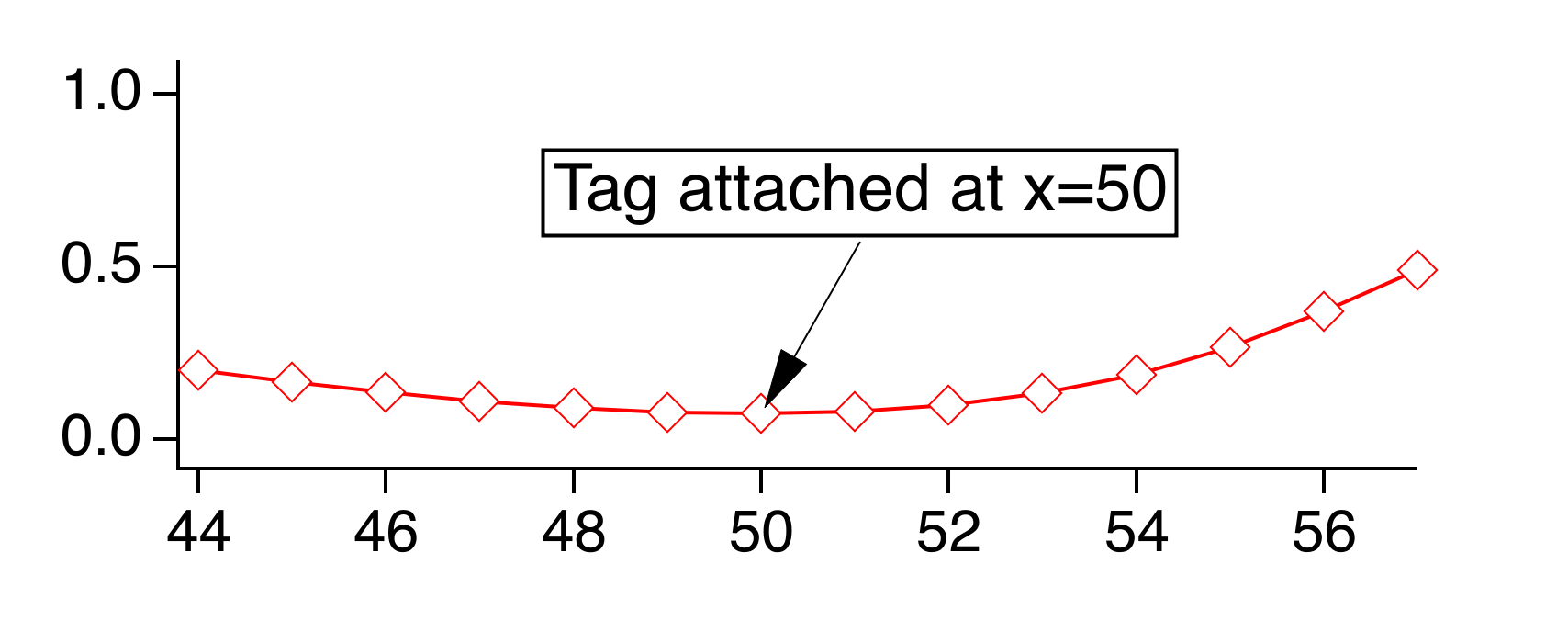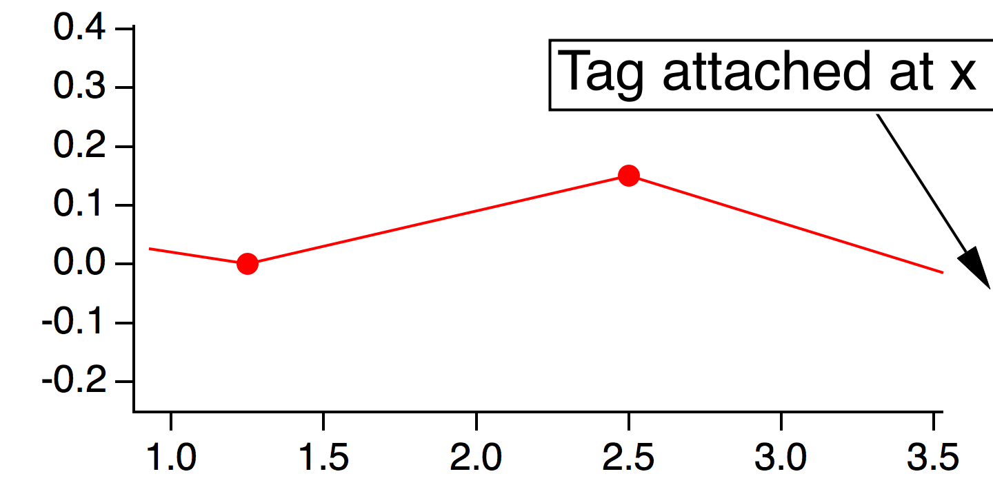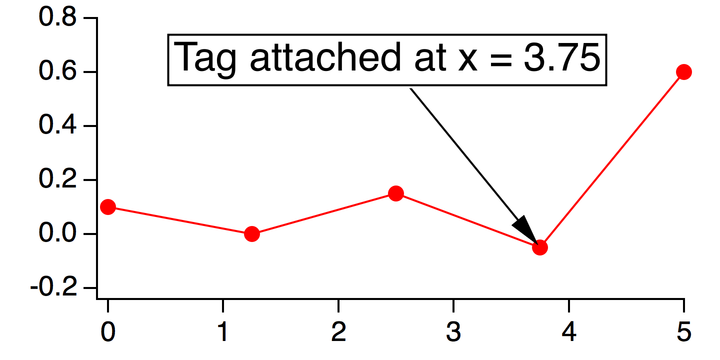 A tag is also similar to a textbox except that it is attached to a point of a trace or image and can contain dynamically updated text describing that point. Tags can be added to graphs, but not to page layouts or Gizmo plots. In contour plots, Igor automatically generates tags to label the contour lines.
