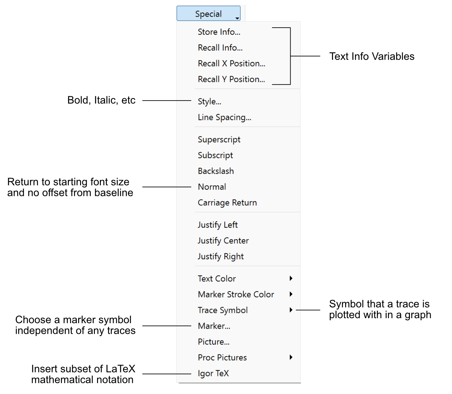 Choosing an item from the Special pop-up menu inserts an escape code that makes subsequent characters superscript, subscript or normal, affects the style, position or color of subsequent text, or inserts the symbol with which a wave is plotted in a graph.
