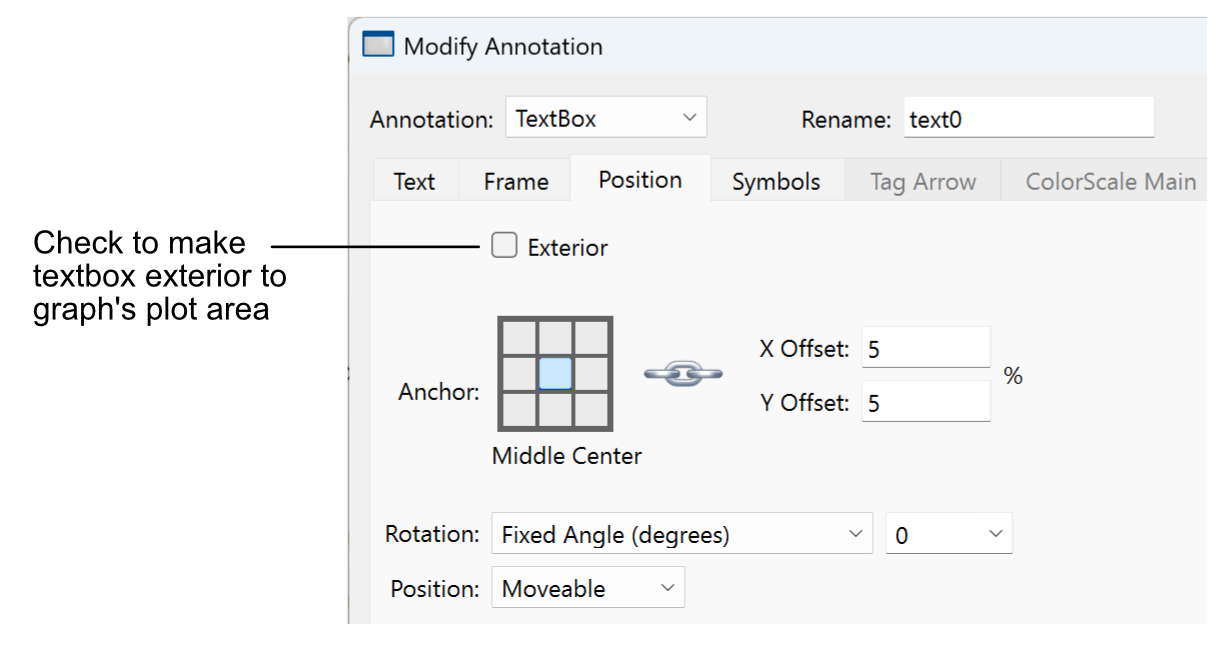 You can assign a name to the annotation with the Name item. In the Modify Annotation dialog, this is the Rename item. The name is used to identify the annotation in a Tag, TextBox, ColorScale, or Legend operation. Annotation names must be unique in a given window. See Programming with Annotations for more information.