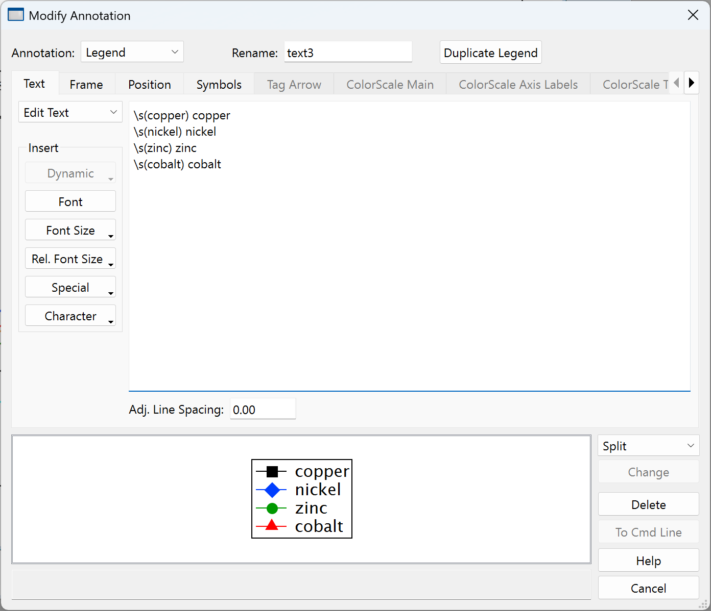 \s is usually used in a legend, in which symbols are created and removed automatically, but can also be used in tags, textboxes, and axis labels where the symbol is updated, but not automatically added or removed. See Legends.