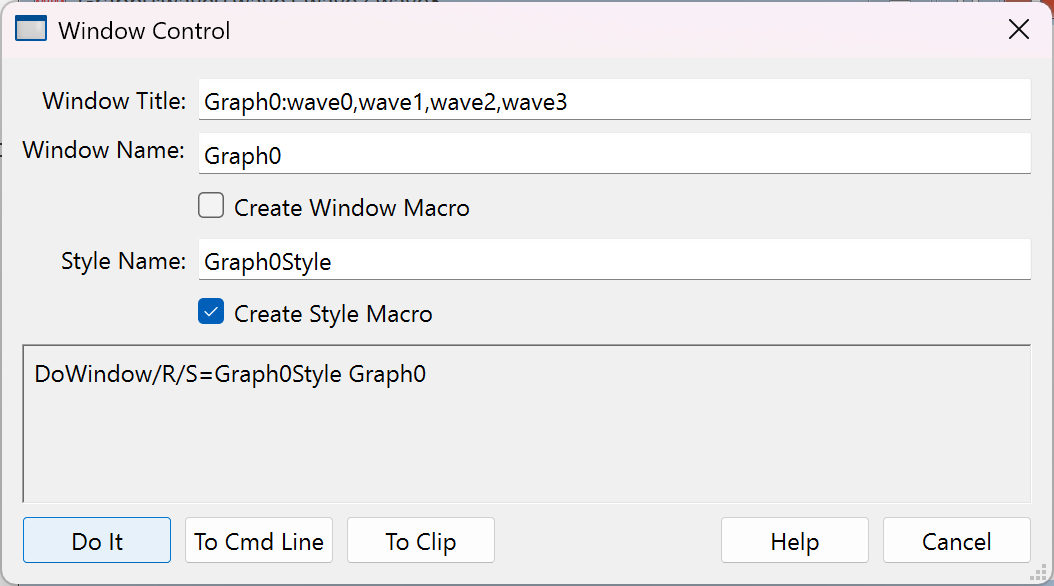 Now we're ready to generate the style macro. With the graph the active window, we choose Windows→Control→Window Control to display the Window Control dialog in which we check the Create Style Macro checkbox.