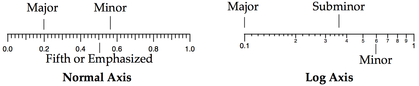 Each of the four standard axes is always attached to the corresponding edge of the plot area. The plot area is the central rectangle in a graph window where traces are plotted. Axis and tick mark labels are plotted outside of this rectangle.