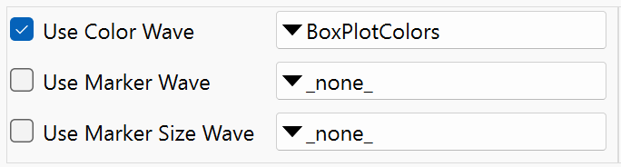 The Category Plots:Axes and Axis Labels and Category Plots:Wave Styles are analogous to the corresponding settings for XY plots. Since they are separate preference categories, you have can independent preferences for category plots and for XY plots. Similarly, preferences for image and contour plots are independent of preferences for other types. See Category Plots, Contour Plots, Image Plots.