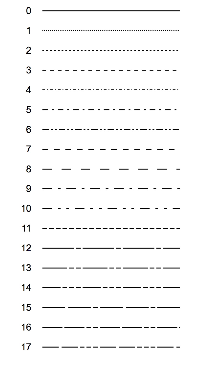 Dashed line 0 (the solid line) cannot be edited. If you need to create a custom dashed line pattern, we recommend that you modify the high numbered dashed lines, leaving the low number ones in their default state. This ensures that the low numbered patterns will be the same for everyone.