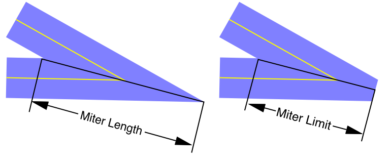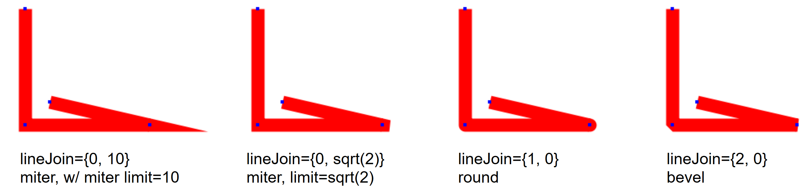 Line joins can have miter, round or bevel styles. For a miter join, you can specify the miter limit to control the length of miters on very acute angles. In these pictures, the blue dots show the position of the ends and join points of the lines: