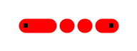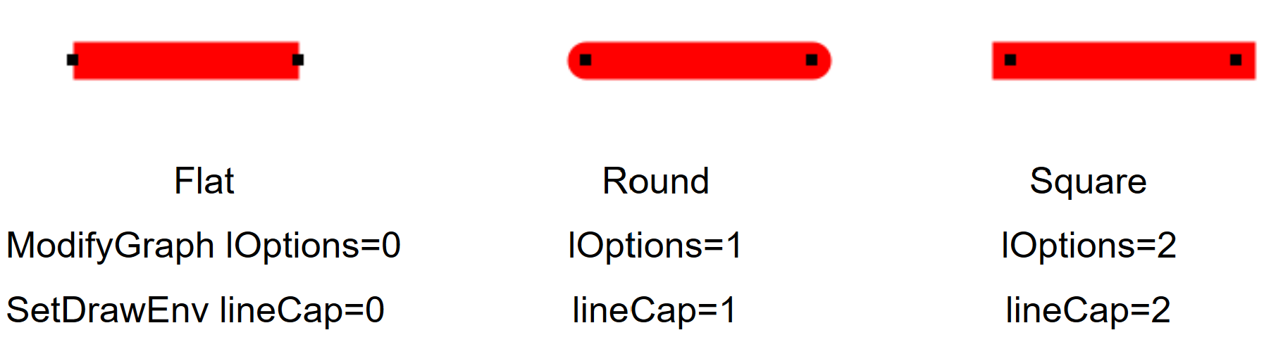 Line caps can be flat, round or square. These pictures show the appearance of each option; the dots show where the geometric end of each line is: