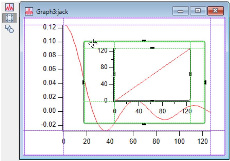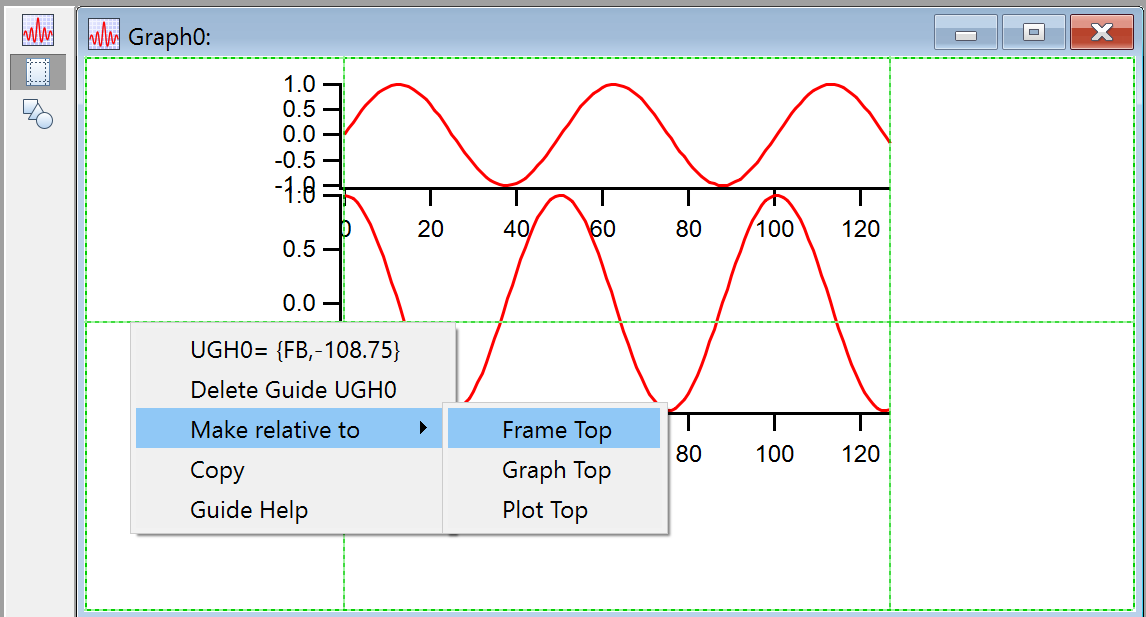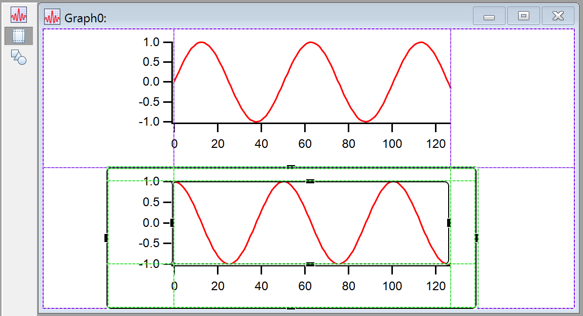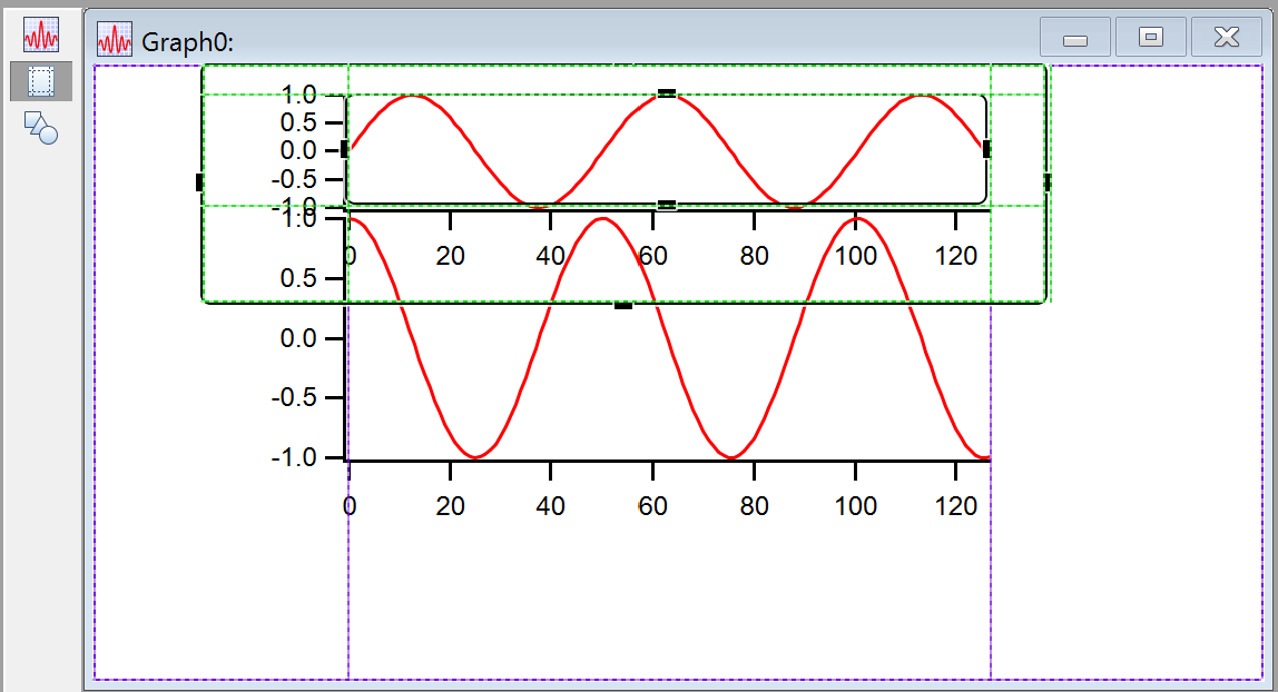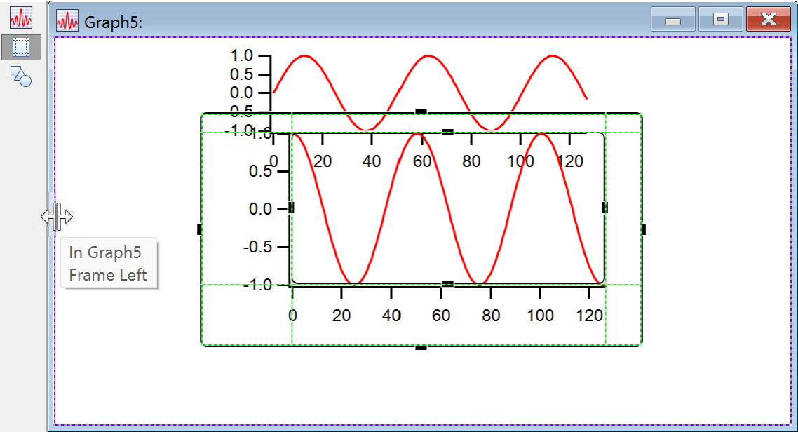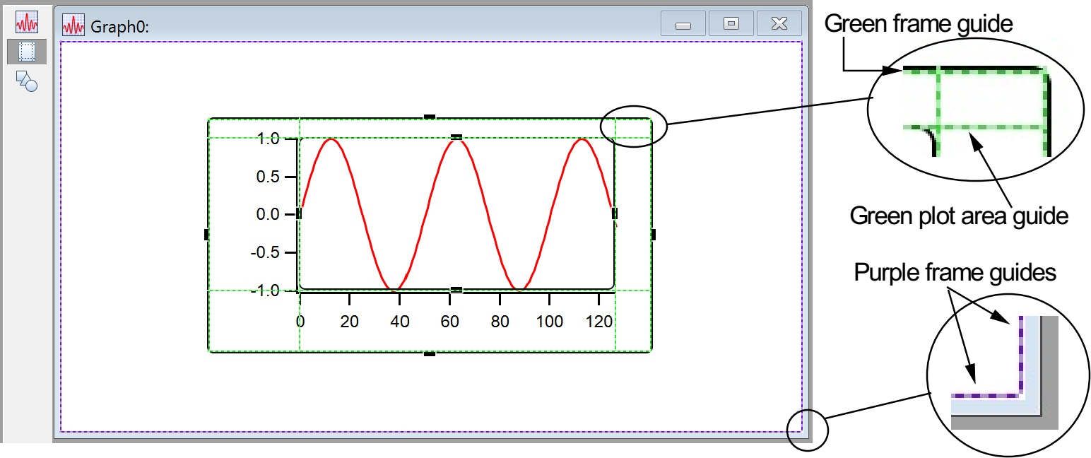 Note the thin purple line just inside the window frame- that shows the built-in guides at the edge of the window, that is, the "frame" guides. The subwindow has green lines just inside the black frame. The frame guides may be hard to see, but they are always there. The subwindow also has plot area guides that can be used to align the axes in the subwindow with features in the host. You can use this feature to make nice-looking stacked graphs.
