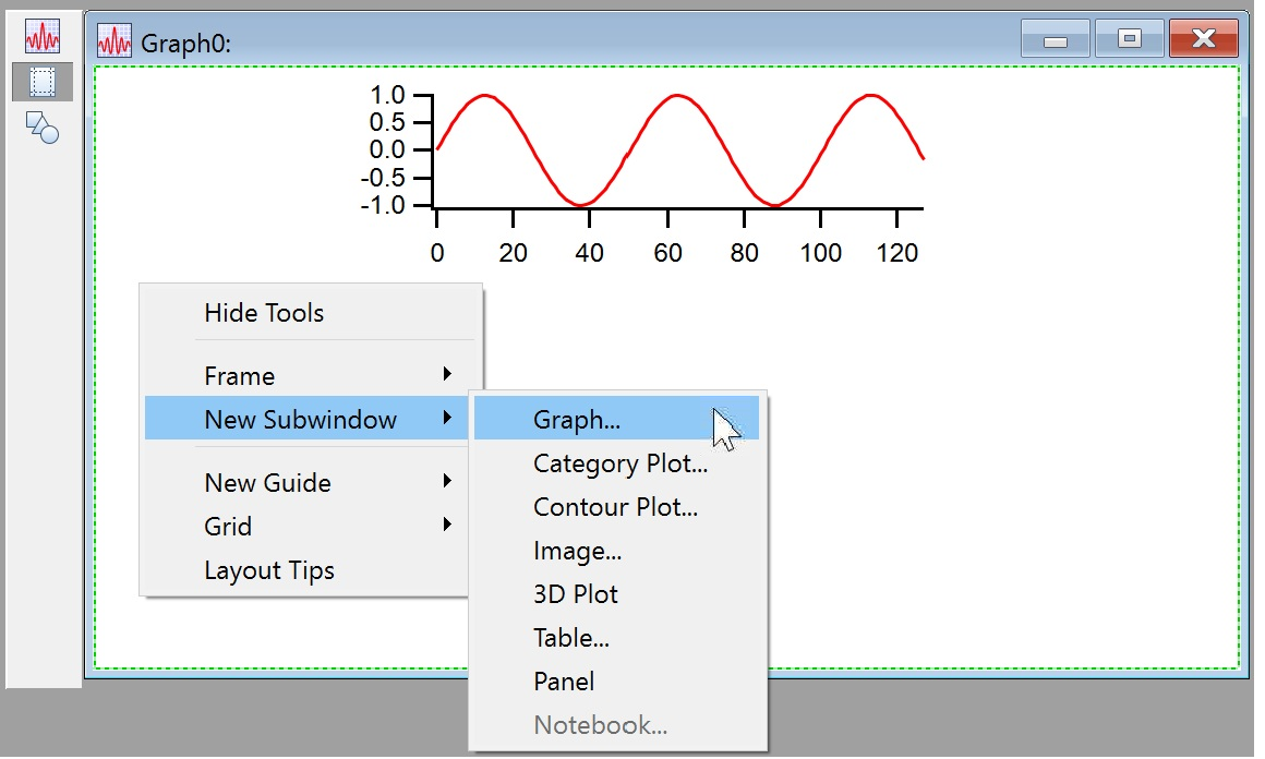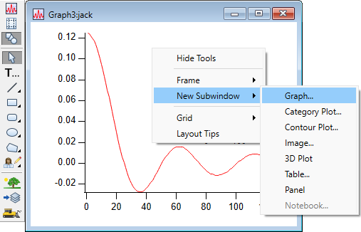 Click outside the subwindow to de-activate the graph subwindow. Right-click below the subgraph and choose New Subwindow->Graph from the pop-up menu: