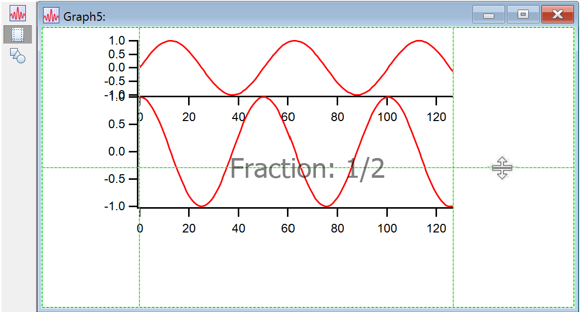 Now click in the lower sub-graph to make it active; attach the plot area handles to the guides in the same way. While still in guides mode, drag the user guides around and notice that the two sub-graphs follow and the vertical axes remain aligned with each other. This also shows why the guides in the subwindow are a different color from the guides in the host window: the plot area guides in the subwindow align with the user guide it is attached to; if they were the same color, they would look like one guide.