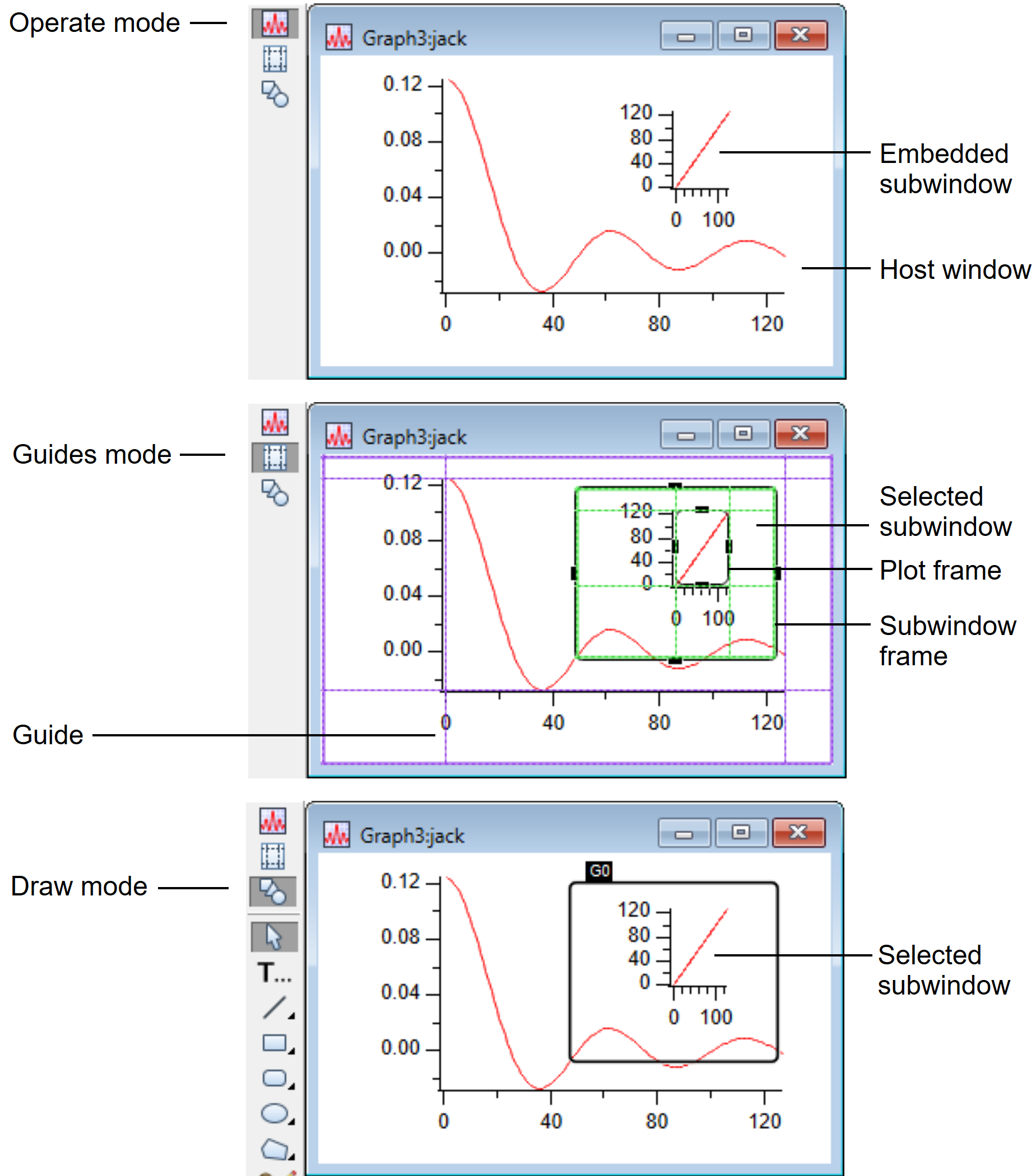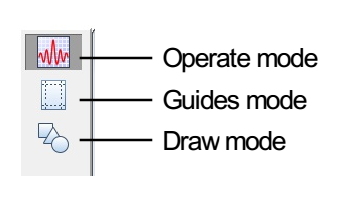 Each host window has three main modes corresponding to the top three icons in the window's tool palette. Choose Show Tools from the Graph or Panel menu to show the tool palette. Clicking the top icon selects operate mode and clicking the second icon selects "Guides" mode, and clicking the third icon selects draw mode.