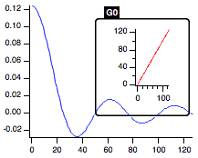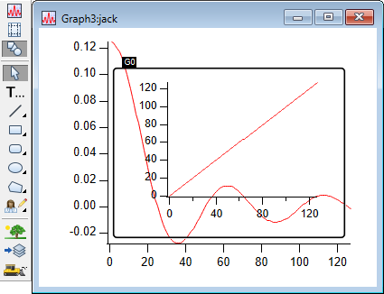 This indicates that it is the active subwindow. Now double-click on the curve in the host window, outside the subwindow border. Change the color of the trace jack to blue and notice that the subwindow is no longer active. Now move the mouse over the subwindow and notice that the cursor changes to the usual shapes corresponding to the parts of the graph that it is hovering over. Drag out a selection rectangle in the plot area of the subwindow and notice that the marquee pop-up menu is available for use on the subwindow and that the subwindow has been activated. Depending on your actions in a window, Igor activates subwindows as appropriate and generally you do not have to be aware of which subwindow is active.