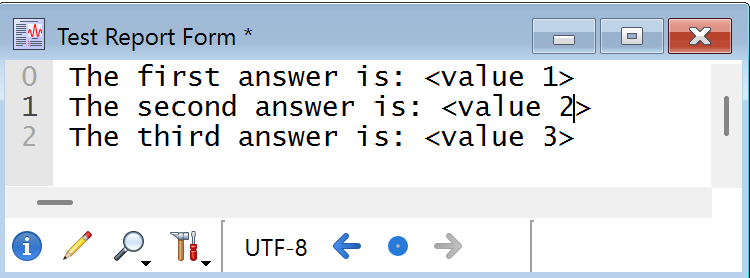 To try this function, enter it in the Procedure window. Then create a notebook that contains "<value 1>", "<value 2>" and "<value 3>" and save it in the Igor User Files folder using the file name "Test Report Form.ifn". The notebook should look like this: