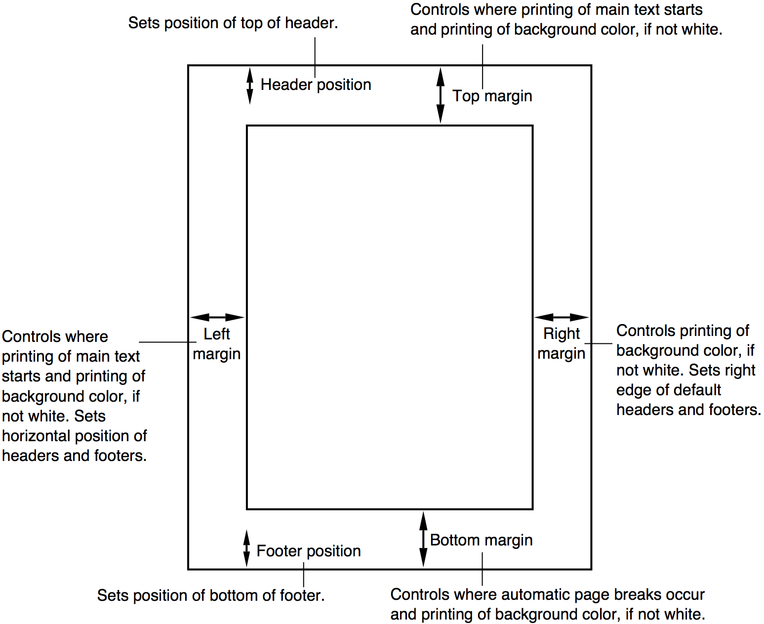 The next illustration shows the effects of the page margins and header and footer position settings. In addition, these settings affect the Rich Text format file which you can use to export a notebook to a word processor.