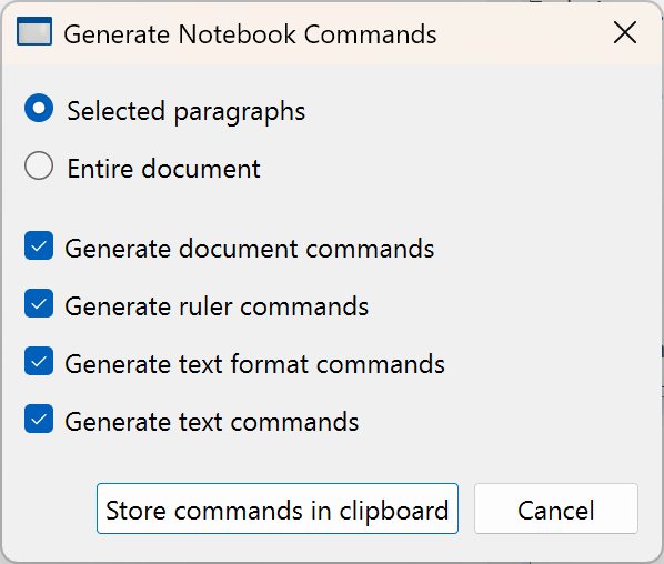 There is a shortcut that generates commands without going through the dialog. Select some text in the notebook, press Alt and choose Copy from the Edit menu. This generates commands for the selected text and text formats. Press the Alt to also generate document and ruler commands.