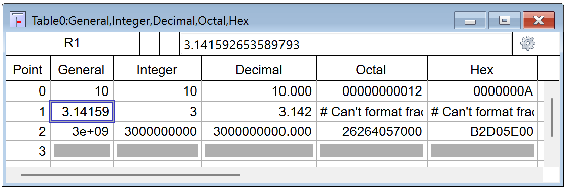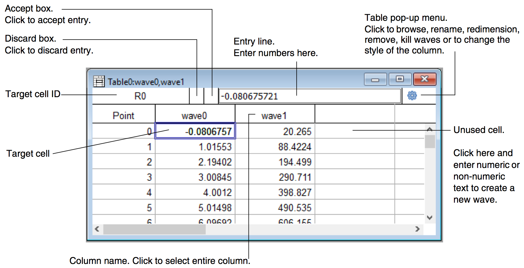 When you enter a data value in the first unused cell, Igor creates a single new 1D wave and displays it in the table. This is handy for entering a small list of numbers or text items. If you enter a numeric value, including date/time values, Igor creates a numeric wave. If you enter a non-numeric value, Igor creates a text wave.