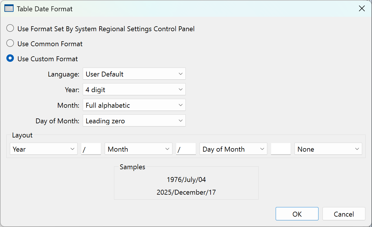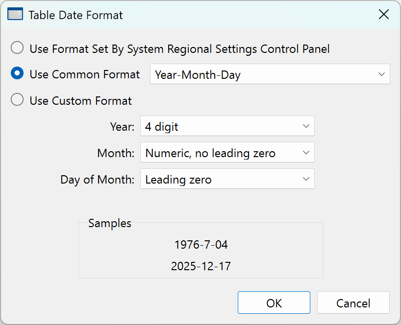 When entering a date, you must use the format selected in the Table Date Format dialog, accessible via the Table menu. The setting in this dialog affects all tables.