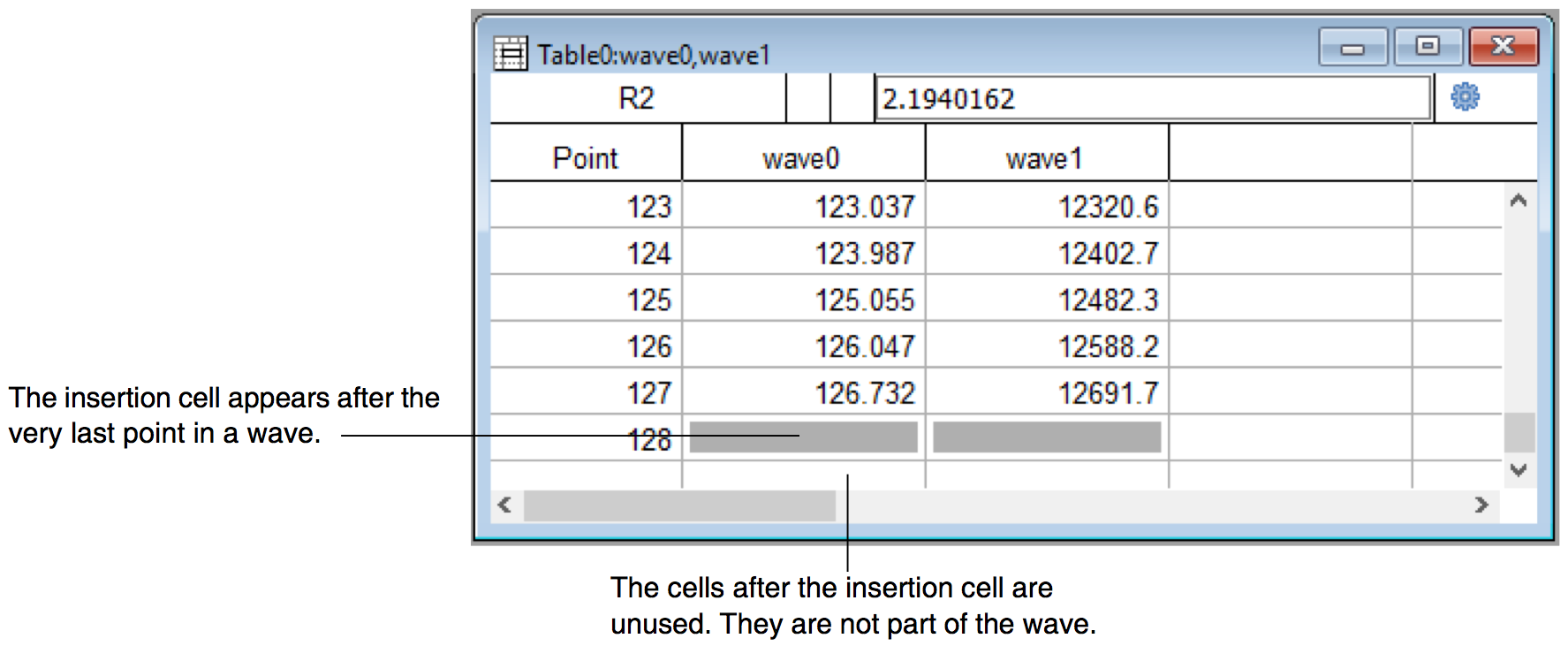 When you create a new wave, the wave has one data point — point 0. The cell in point number 1 appears gray. This is the insertion cell. It indicates that the preceding cell is the last point of the wave. You can click in the insertion cell and enter a value or do a paste. This adds one or more points to the wave.
