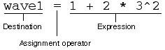 Assignment statement commands start with a wave or variable name. The command assigns a value to all or part of the named object. An assignment statement consists of three parts: a destination, an assignment operator, and an expression. For example:
