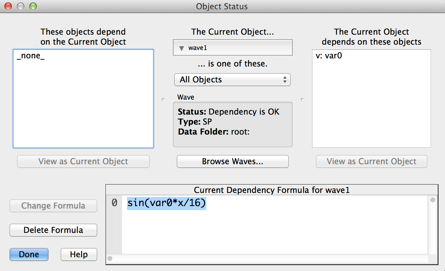 then Igor does create just such a dependency. Now whenever var0 changes, Igor reevaluates the assignment and updates. In this example, wave0 is a dependent object. It depends on var0, and "sin(var0*x/16)" is wave0's dependency formula.