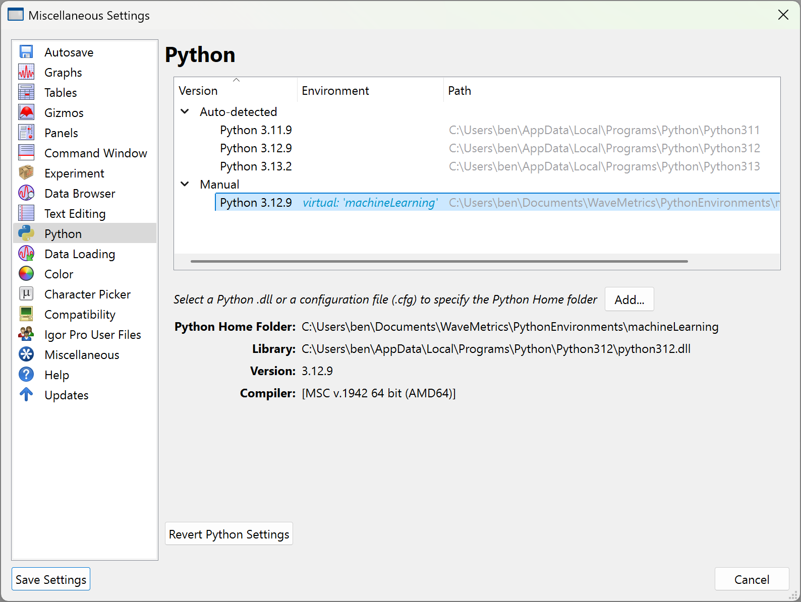Once Python is installed, users must configure Igor to use a specific installation of Python, which is done in the Miscellaneous Settings dialog. In the Python menu, select Settings.... Python installations that are already on your system path should be automatically detected and available for you to select.