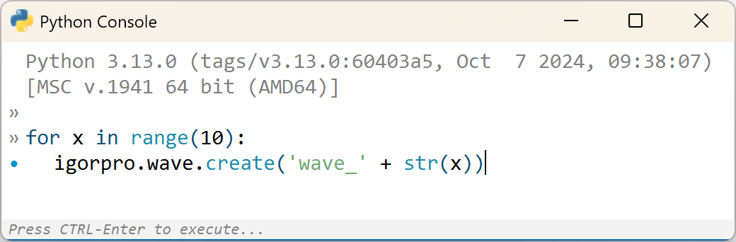 The Python Console supports multi-line statements, such as function or class definitions, conditional statements, multi-line strings, loops, and explicit line continuation ( \ ). A dot in the left margin indicates that a multi-line statement is in progress. For example, this for-loop will create 10 waves in Igor (wave_0, wave_1, ...):