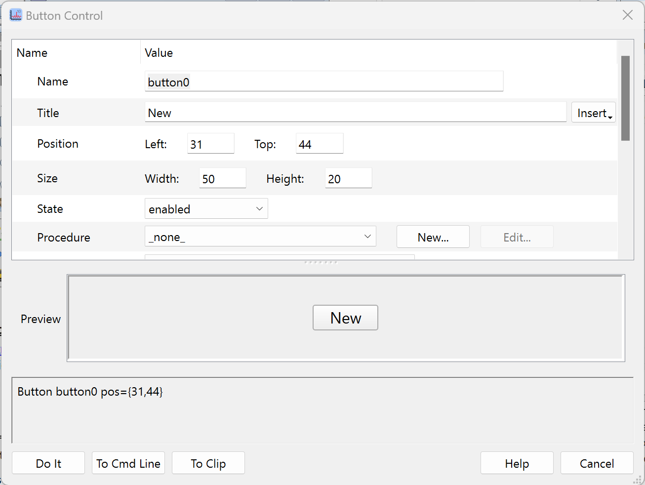 Button button0 win=Panel2, pos={100,50}, size={100,20}, title="Button"