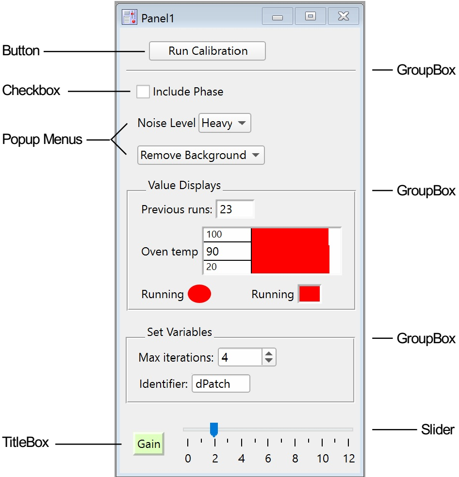 The following panel window illustrates most of the control types.