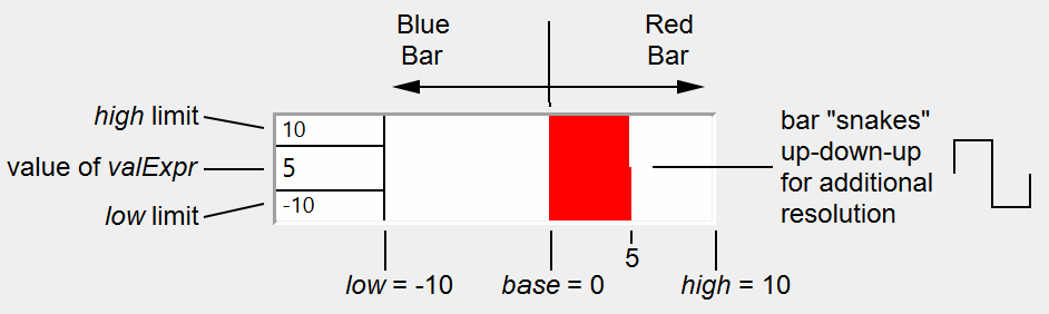 When a thermometer bar is shown, the left edge of the thermometer region represents a low limit set by the programmer while the right edge represents a high limit. The low and high limits appear in some of the above examples. The bar is drawn from a nominal value set by the programmer and will be red if the current value exceeds the nominal value and will be blue if it is less than the nominal value. In the above examples the nominal value is 60. There is no numeric indication of the nominal value. If the nominal value is less than the low limit then the bar will grow from the left to the right. If the nominal value is greater than the high limit then the bar will grow from the right to the left.