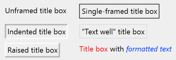 | TitleBox | An organizational element. Provides explanatory text or message. | |