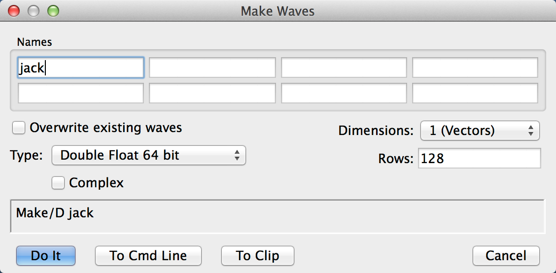 When you choose a menu item, like Data→Make Waves, Igor presents a dialog: