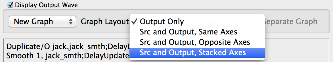 When you select New Graph, there are four choices in the Graph menu for the contents and layout of the new graph. In this menu, "Src" stands for Source. It is the wave containing the input data. Output is the wave containing the result of the operation.